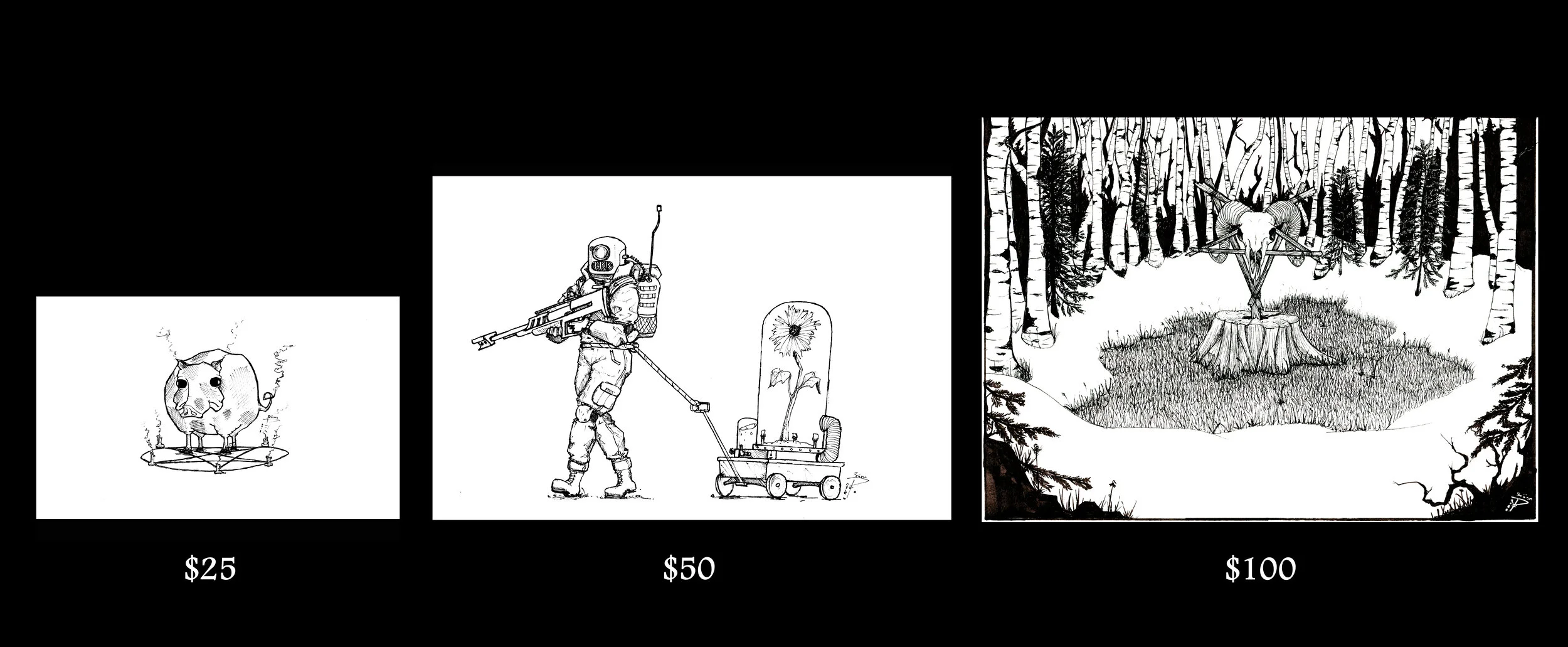 The pricing for original pieces such as character designs, comics, album art etc. will have an initial flat rate depending on the size and level of detail of the piece.